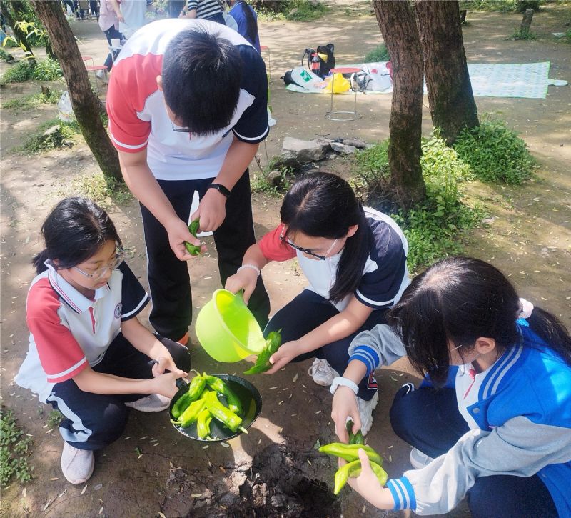 野炊的過程并不總是快樂,也會有各種險阻,比如受到空間場地的局限,差點把鍋掀翻;比如火生不燃,或者時而有蚊蟲蒼蠅的“問候”;比如用水不便……經(jīng)過同學(xué)們合力思考、因地制宜,問題都能一一化解??救?、火鍋、炒菜,不在話下,配上水果、甜品、檸檬茶,氛圍感更佳。