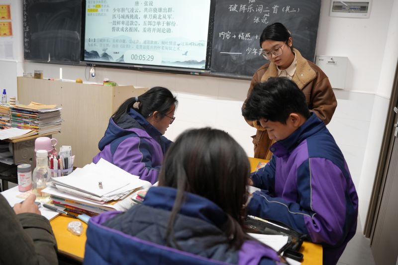 推開206班的教室門,同學(xué)們正齊聲朗誦詩歌,秩序井然。譚老師為課堂設(shè)置了兩個教學(xué)探究題,讓學(xué)生通過自主學(xué)習(xí)、小組交流討論、集中展示等環(huán)節(jié)深入把握詩歌內(nèi)涵,理解少年英雄的形象特點(diǎn),探討詩歌語言特色。探究重點(diǎn)突出,目標(biāo)明確。課堂最后讓學(xué)生書寫心目中的少年英雄形象,引導(dǎo)學(xué)生在生活中用實(shí)際行動踐行“少年膽氣凌云,共許驍雄出群”的氣魄與擔(dān)當(dāng)。
