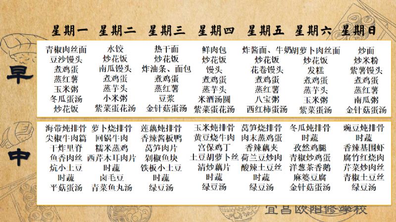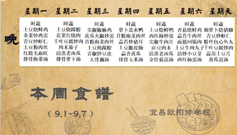 宜昌歐陽修學校每周食譜(9月1日至9月7日)